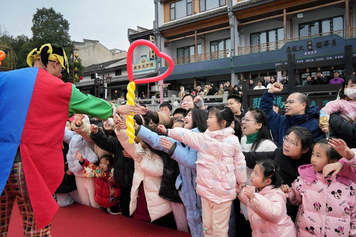 更让人欣喜的是,老长沙民俗文化通过创新形式焕发新生机。“靖港太好玩了!”成为孩子们说的最多的话。萌娃们在定向寻宝中化身“小探险家”,在射箭、投壶、踢毽子、锤钉子等传统游戏里赚饱了商票;全家一起猜灯谜、做糖画、体验手工制作乐开了花,传统年俗在互动体验中变得鲜活可触。街巷中,福禄寿喜“吉祥四宝”、派发好运的财神等NPC天团,为游客送福气惊喜互动,不少家长赞叹道:“孩子追着财神跑了半条街,这种沉浸式体验太有意思了。”