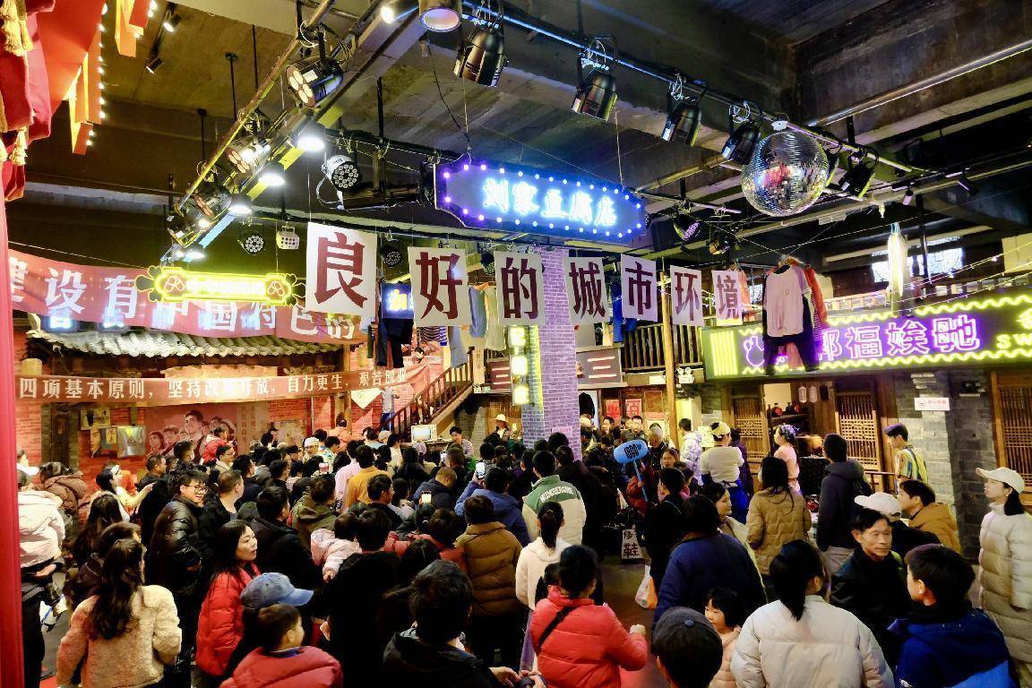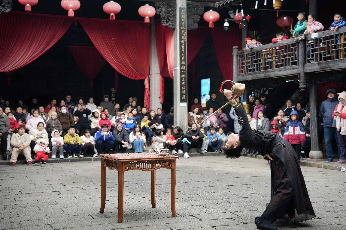 靖港古街张灯结彩、处处是戏、人流如织,洋溢着节日的欢声笑语。楚河码头化身开放式舞台,“潮韵戏元旦”联谊派对嗨不停,魔术、劲舞、旗袍秀与乐队表演轮番登场,台下全家老小随着音乐一起摇摆;八元堂里湘韵悠扬,变脸喷火绝技赢得阵阵喝彩,孩子们兴奋举着手机拍照;黄金年代剧场的复古派对乐翻天,陶承故居里演绎着“革命母亲”感人至深的大爱,古桥上湘韵戏影演绎东方美学,老街中喜嫁迎亲传递着喜悦……非遗民俗与当代演艺在满镇自然生长,全域漫游、步步皆景,真正实现了“满镇都是戏”的畅快体验。